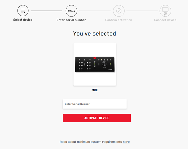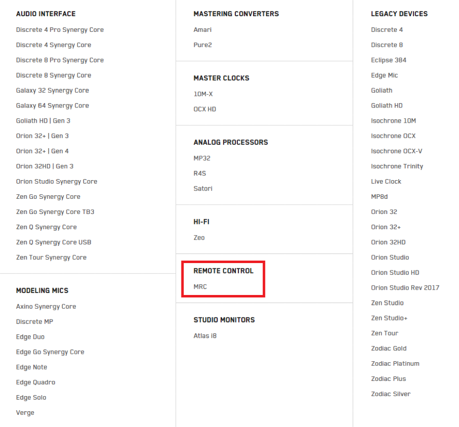Antes de continuar, asegúrate de que la interfaz Galaxy 32 Synergy Core u Orion 32+ Gen4 vinculada se haya actualizado completamente para poder utilizar el control remoto MRC. Ve al menú Administrar de dispositivo de la interfaz e instale el último paquete disponible.